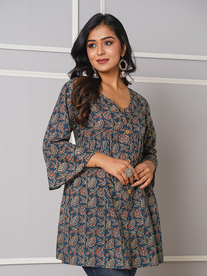 Enhance your casual wardrobe with this Blue Leaf Printed Hand Block Cotton Top, a perfect blend of comfort and style. Crafted from premium, breathable cotton, this top features a serene blue base adorned with intricate leaf hand block prints, showcasing traditional artistry. Its lightweight fabric and relaxed fit ensure all-day comfort, making it ideal for warm weather or layering during cooler days. The versatile design pairs effortlessly with jeans, skirts, or trousers, making it suitable for casual outings, work, or leisure. Easy to style and maintain, this top adds a touch of elegance to your everyday wear collection.
