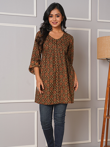 Give earthy elegance to your wardrobe with this Brown Cotton Hand Block Printed Top. Crafted from premium-quality cotton, this top features a rich brown hue enhanced by intricate hand block prints, showcasing traditional artistry. The breathable fabric ensures comfort throughout the day, while the relaxed fit offers effortless style and ease of movement. Perfect for casual outings, work, or relaxed gatherings, this versatile top pairs beautifully with jeans, skirts, or trousers. Lightweight and easy to maintain, it combines timeless craftsmanship with modern functionality, making it a must-have addition to your everyday wear collection.