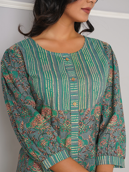 Be the first to review “Leaf Green Mix Cotton Hand Block Printed Top”